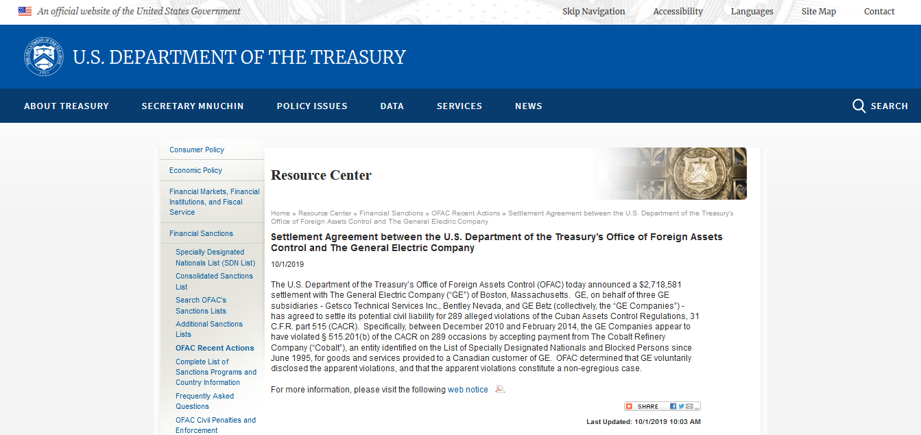 La firma norteamericana con sede en Boston, Massachusetts, acordó pagar la deuda de $2,718,581 a nombre de tres subsidiarias (Getsco Technical Services Inc., Bentley Nevada y GE Betz), las cuales incurrieron en 289 violaciones del Reglamento de Control de Activos Cubanos desde diciembre de 2010 hasta febrero de 2014.