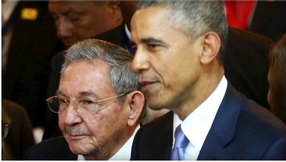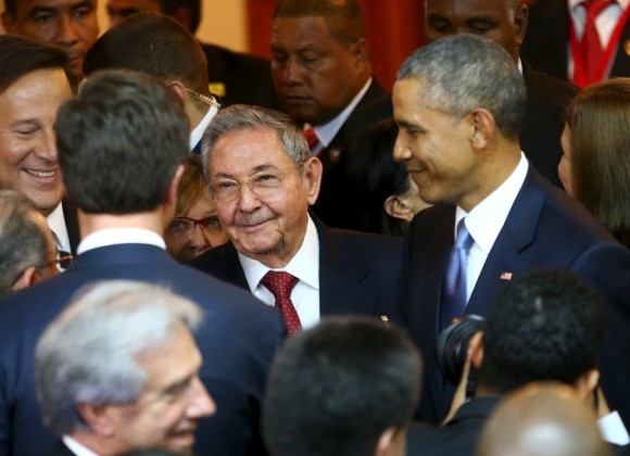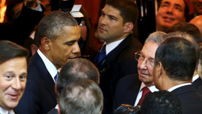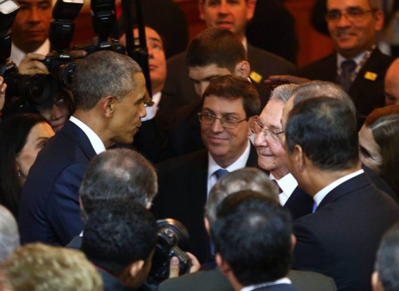 El presidente cubano Raúl Castro y Barack Obama, presidente de los Estados Unidos se saludan en la Cumbre de las Américas. (Foto: Reuter).