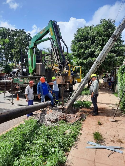 Lineros en Artemisa trabajan para restablecer postes caídos tras fuertes vientos de huracán Ian (Foto: Empresa Eléctrica de Artemisa)