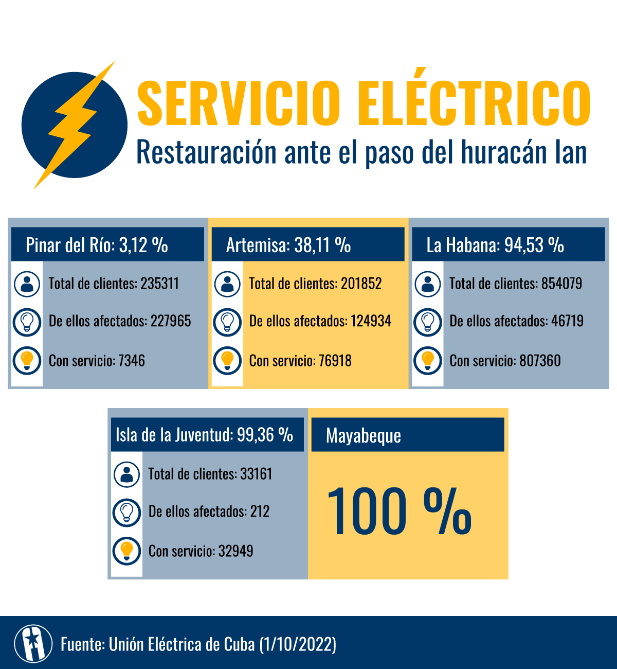 La provincia de Pinar del Río, por donde tocó tierra el huracán Ian, fue la más afectada por este evento hidrometeorológico. Según reportes de las autoridades locales todo el territorio sufrió daños en el servicio eléctrico. Hasta ayer solo contaba con electricidad gracias a grupos electrógenos en algunas localidades. También se anunció que se garantizaban los servicios básicos como hospitales, panaderías y campos de pozos de agua mediante esos grupos.