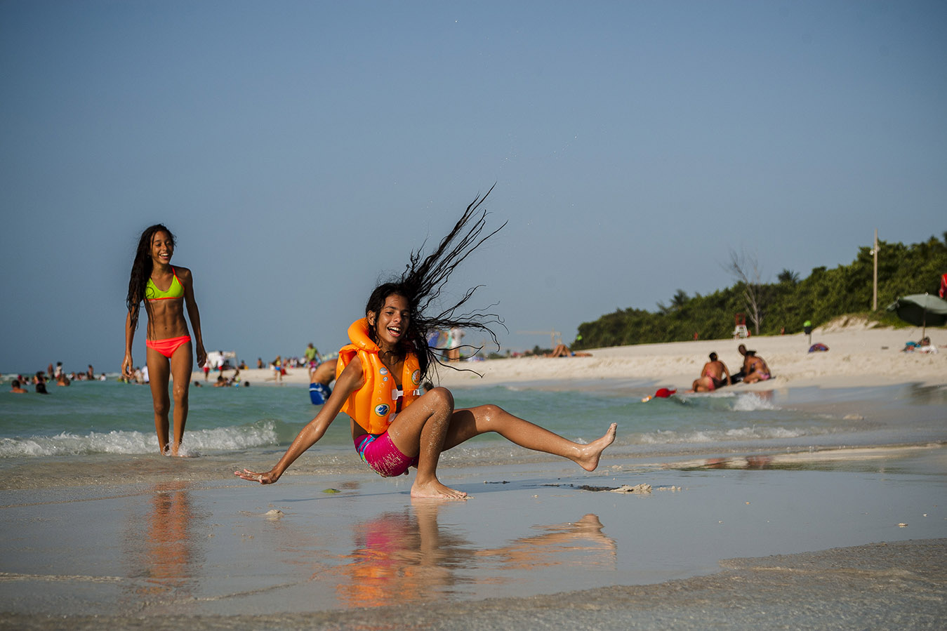 Un grupo de jóvenes juega voleibol, una niña salta mientras otra casi cae de su pequeño salvavidas, casas de campaña para protegerse del sol: las escenas en la playa son infinitas, y si se fotografían desde el agua todavía más.