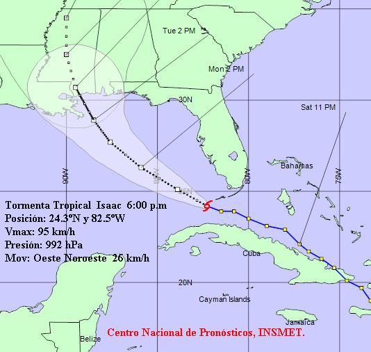 Durante la madrugada la Tormenta Tropical Isaac ha continuado moviéndose al oestenoroeste a 22 kilómetros por hora avanzando por la porción este del golfo de México, con vientos máximos sostenidos de 100 kilómetros por hora y su presión mínima ha descendido hasta 990 hectoPascal.