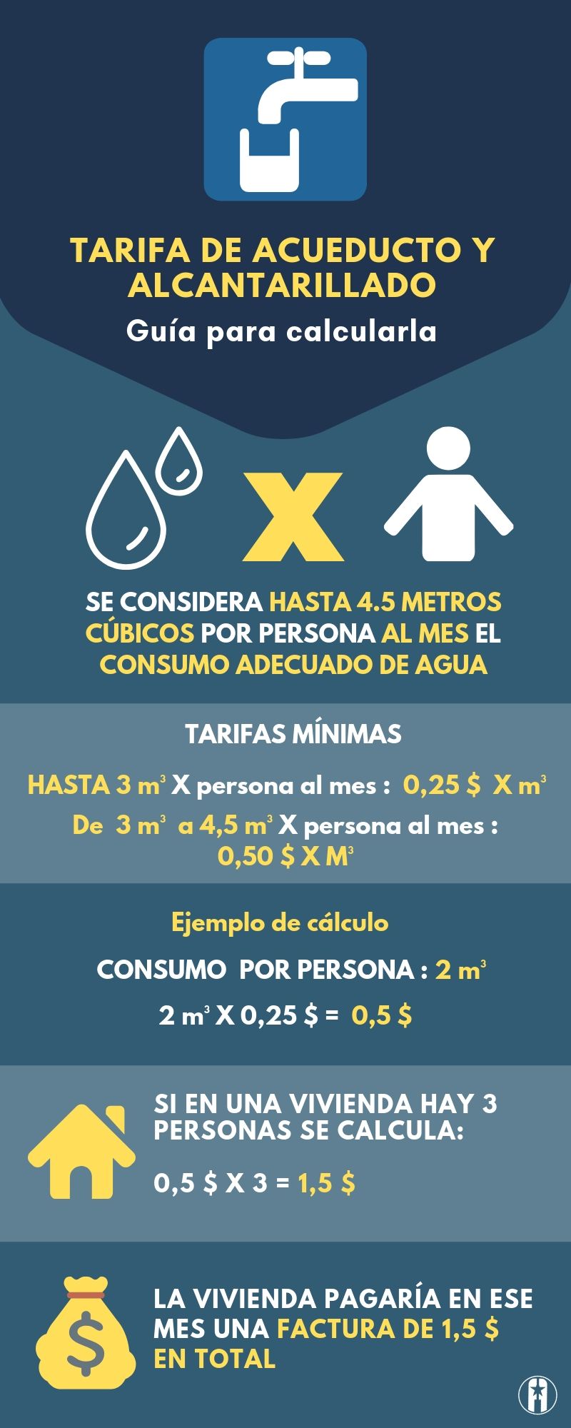 En primer lugar se tuvo en cuenta para establecer el consumo mínimo de agua el aceptado por la Organización Mundial de la Salud para vivir con casi ningún riesgo a la salud. Esta contempla que en tal caso una persona debe tener acceso para el consumo doméstico de 50 a 100 litros de agua al día.