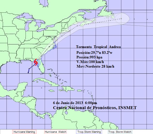 La Tormenta Tropical Andrea se desplaza en dirección nordeste y ha incrementado su velocidad de traslación hasta 44 kilómetros por hora.