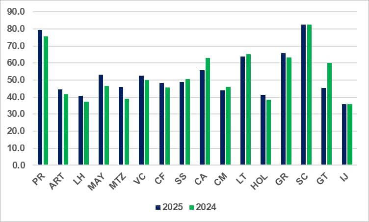 El siguiente gráfico muestra los resultados por provincias, del porciento de aprobados en los tres exámenes, que evidencia como en la mayoría de los casos los resultados del presente curso fueron superiores a los del pasado.